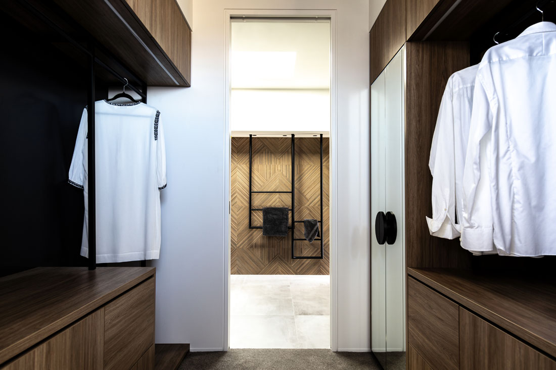 Material and palette play a major role in Michelle’s contemporary master ensuite. A timber-look tile provides plenty of rich tones and grain changes and is replicated in the joinery throughout the suite. The pearl coloured tiles have been used to complement the use of concrete and oxidized metals throughout the rest of the home and also to provide a light, fresh backdrop for the timber and pops of blackened steel. The bathroom includes a large double shower with twin rain heads, a double vanity and custom-designed black towel rails.